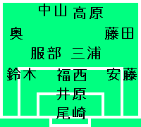 基本的にはNo.1と同じなんですけど、井原さんをセンターバックに置いてみました。ヒデト,アンドーがサイドの守備&攻撃の起点になってもらって、フクちゃんはリベロって言うより、ボランチの感じ。 で、井原さんにDF最後の砦になってもらって、所謂昔の(?)スイーパーのような仕事してもらいましょう。GKはアジアの守護神、大神で。 | |