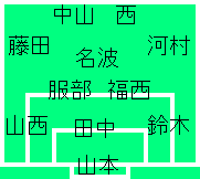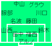 ここ数年、基本的に3-5-2で変わっていませんよね。まぁ、メンバー的に一番フィットするのでしょう。私個人的には4-4-2が好きなんですけど。 ツートップの一方は中山隊長!そして昨年の高原の穴を埋めるのは...西クンかグラウか...日本人の成長に期待したいと言うことで西クンを置いてみました。中盤は名波を中心にトシヤ、ハット、フクちゃん、カワムで構成。河村もより一層の成長が必要ですね。DFはヤマ、ヒデト、マコ、これで決まりでしょう! オーソドックスだけど、悪くないと思うけどな。 |